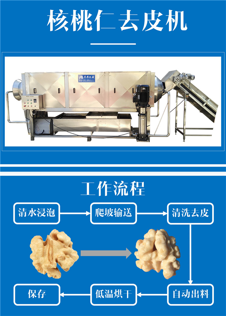 核桃仁漂燙機加熱方式有兩種蒸汽加熱和電加熱(根據(jù)客戶需要選擇合適的加熱方式),設備雙層網(wǎng)帶設置有效的壓制了核桃仁的上浮,核桃仁漂燙結(jié)束后由網(wǎng)帶輸送到核桃仁去皮脫皮設備內(nèi),以保證核桃仁的色澤和口感。設備配有氣動角座閥漂燙池內(nèi)溫度降低時會自動補入蒸汽。漂燙池內(nèi)溫度達到設定溫度時自動關(guān)閉以節(jié)能!