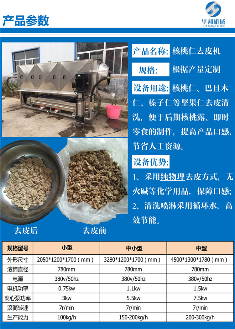 制作核桃粉核桃仁的去皮機技術(shù)參數(shù):