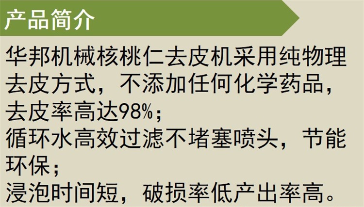 LN核桃仁去皮機(jī)主要作用:利用高壓水流沖洗掉核桃仁表面的皮衣,因?yàn)楹颂胰时砥ぐl(fā)澀,口感不好,在核桃露、核桃醬、保鮮核桃、琥珀核桃、核桃飲料等產(chǎn)品的加工過程中是一個(gè)困擾,山東華邦生產(chǎn)核桃仁去皮清洗機(jī),專門針對(duì)核桃仁表皮的沖洗,連續(xù)式工作,操作簡單,去皮率高,自動(dòng)化程度高,節(jié)省人工。