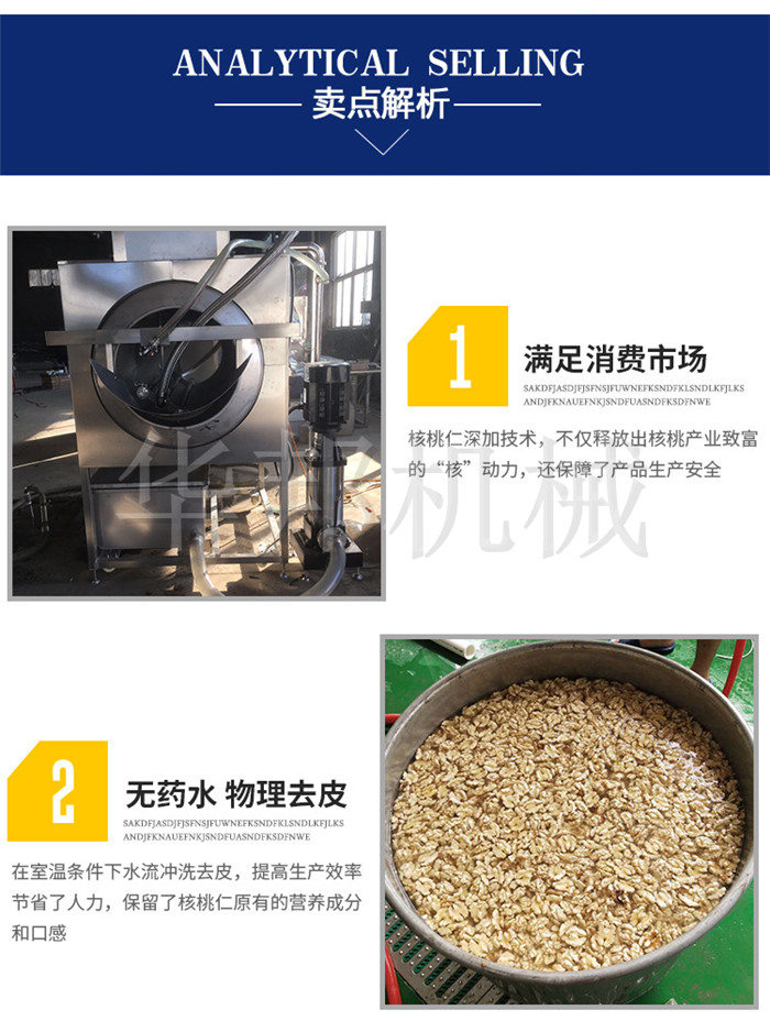 華邦機(jī)械純物理核桃仁去皮機(jī)(不添加堿,純清水浸泡)采用滾筒連續(xù)式工作,自動(dòng)連續(xù)式的不間斷的翻滾配合多級(jí)高壓泵的作用,可以快速取出清洗掉核桃仁表面的浮皮,使用為了節(jié)約用水的原則循環(huán)利用,高效節(jié)能水資源!